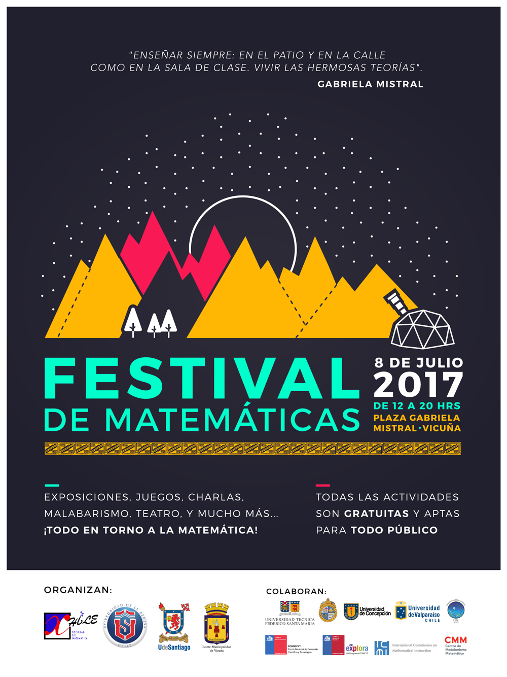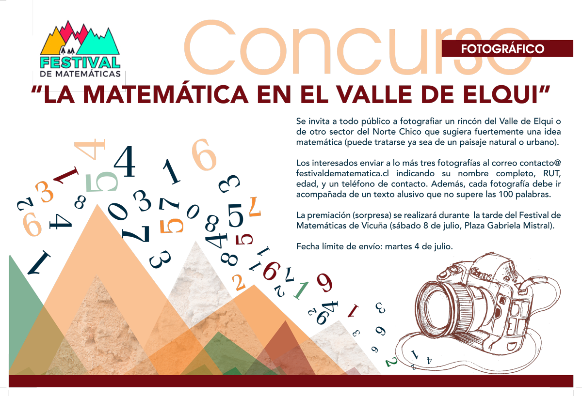 El II Festival de Matemáticas se realizará el próximo 8 de julio en la ciudad de Vicuña. De su organización es encargarán la Sociedad Matemática de Chile, la Universidad de Santiago, la Universidad de La Serena y la Municipalidad de Vicuña. El evento se realizará en la plaza Gabriela Mistral de Vicuña entre las 12:00 y 20:00 horas, y considera alrededor de 22 exposiciones permanentes, con diversas temáticas y actividades paralelas como una obra de teatro y charlas en el Teatro Municipal.